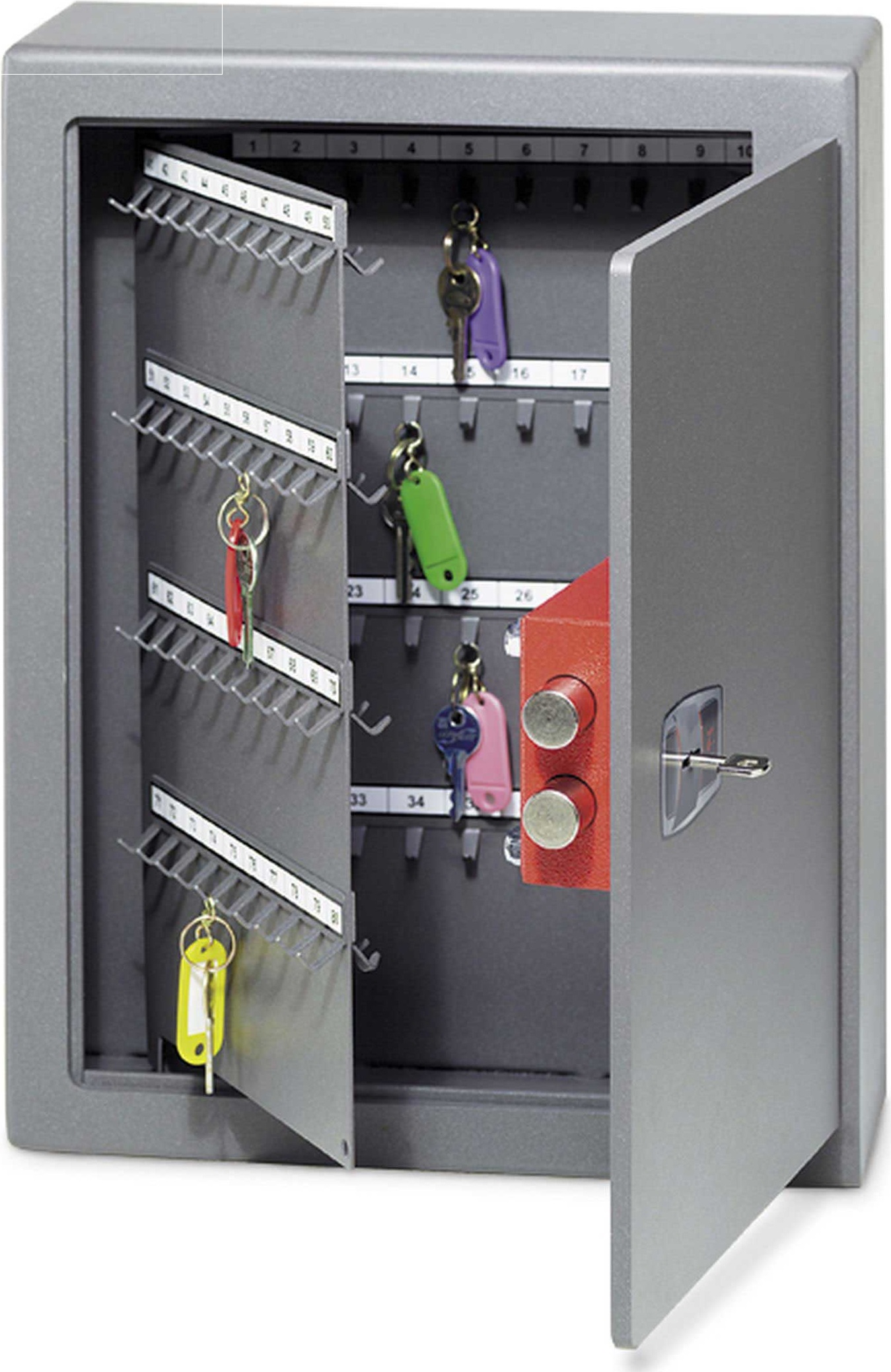 Ενισχυμένο ειδικό χρηματοκιβώτιο κλειδιών με 40 ή 120 μεταλλικών γάντζων σε σωστή απόσταση μεταξύ τους ώστε να τοποθετούνται τα κλειδιά που θέλουμε να ασφαλίσουμε. Μασίφ ατσάλι χωρίς κενά κομμένο με λέιζερ, προστατευτική πλάκα μαγγανίου μπροστά από την κλειδαριά χρηματοκιβωτίου 6 δίσκων, εγγυώνται με σιγουριά την ασφάλεια των κλειδιών σας.